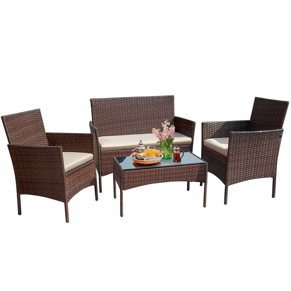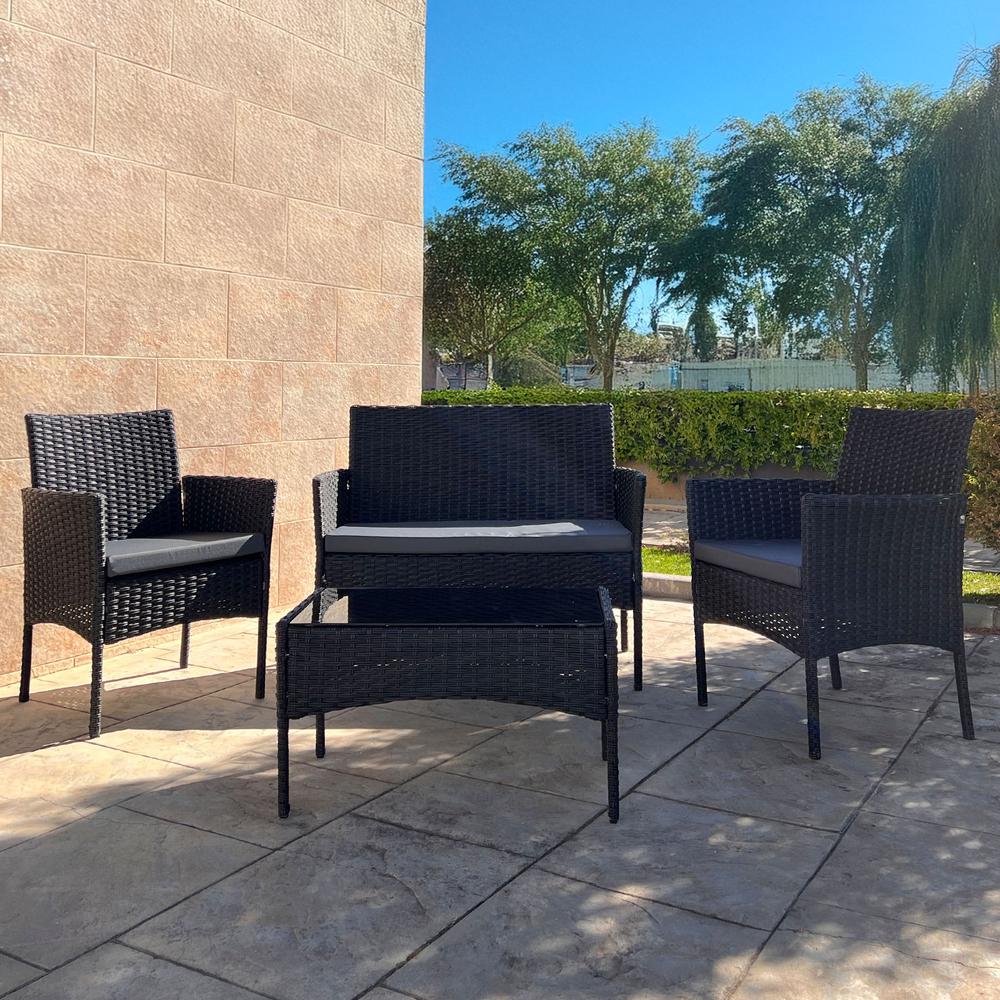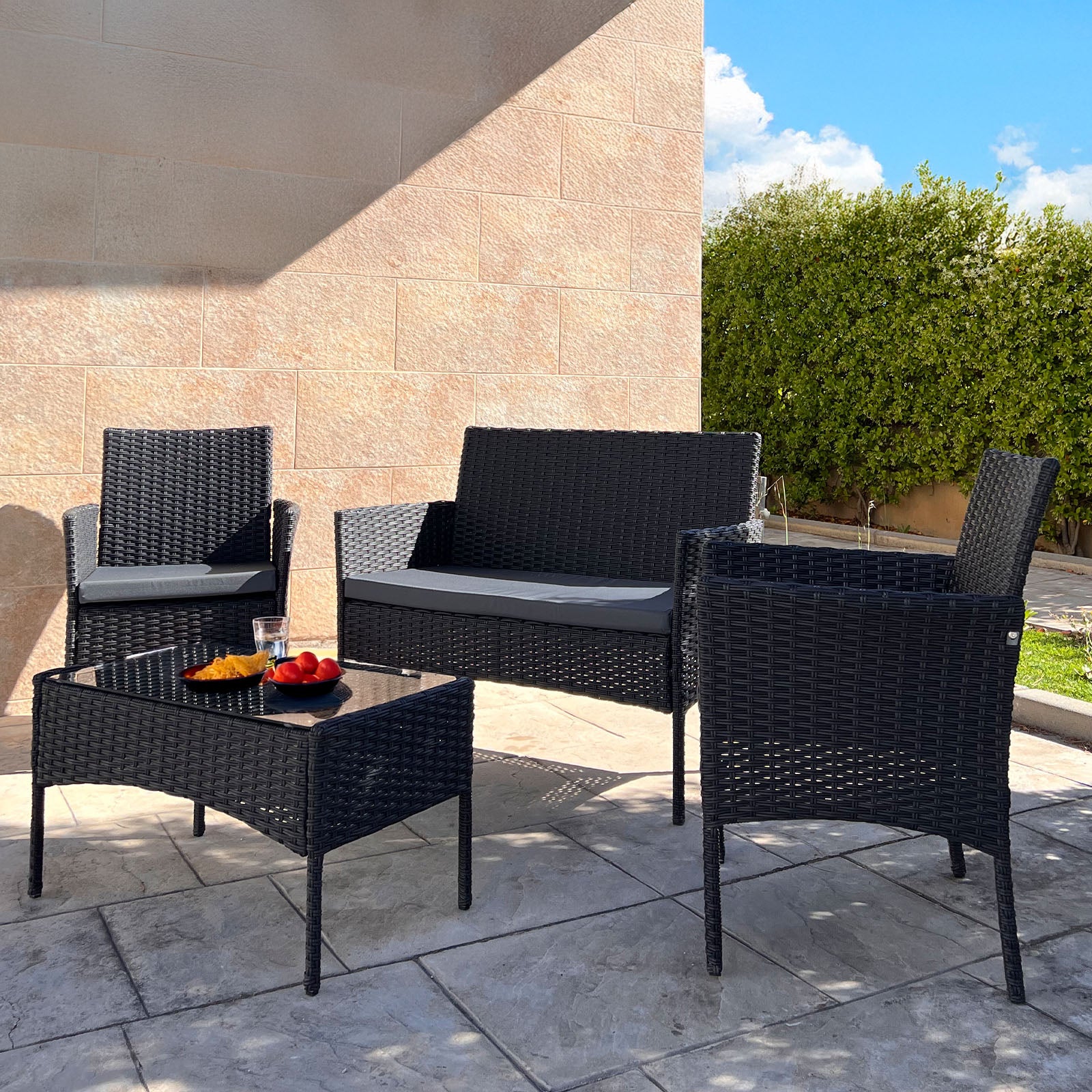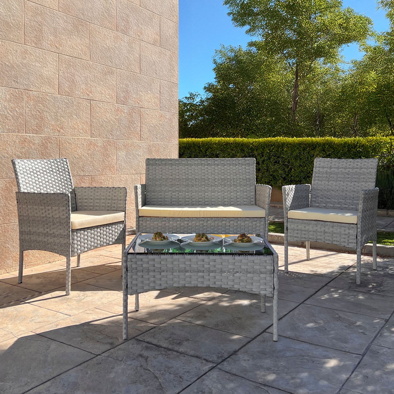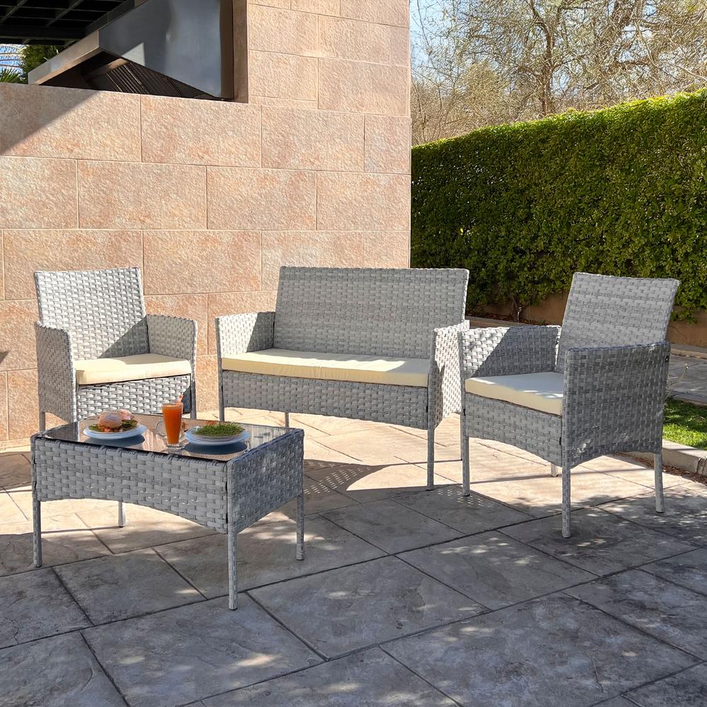 Conjunto de muebles de jardín de ratán, 4 plazas, disponible en tres colores.