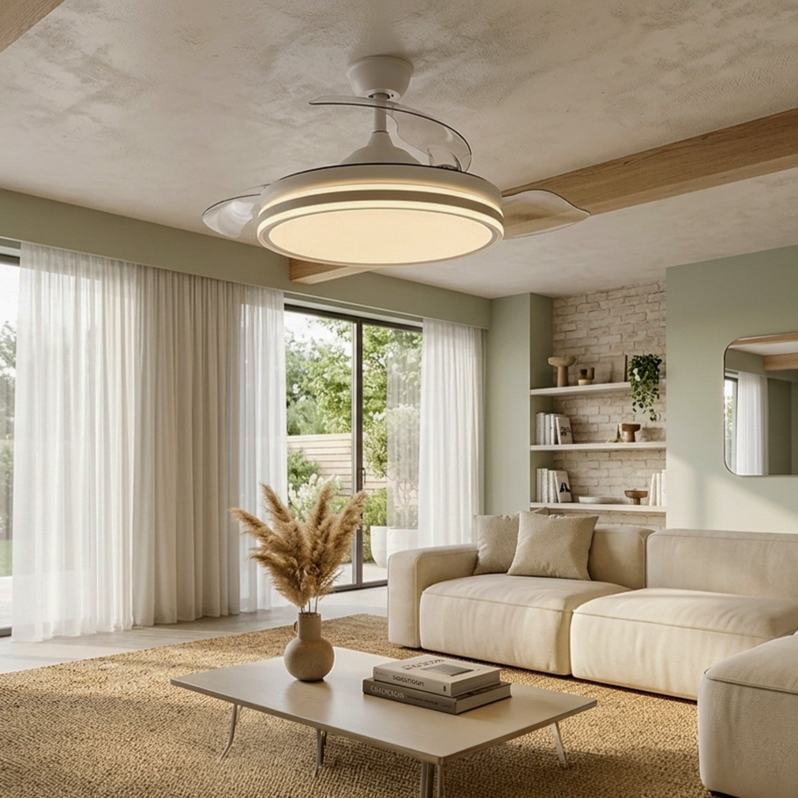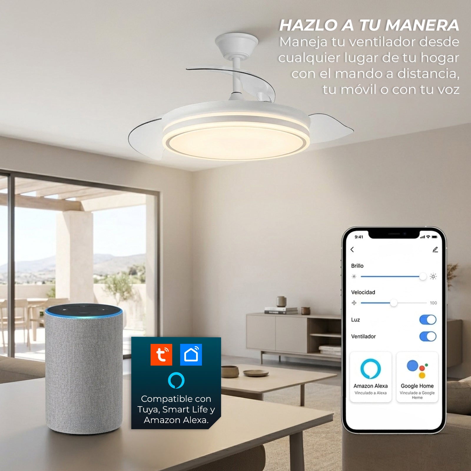 Ventilador de techo con luz LED inteligente, compatible con Alexa, con motor DC silencioso, 6 velocidades, aspas retráctiles y control por app y mando a distancia.